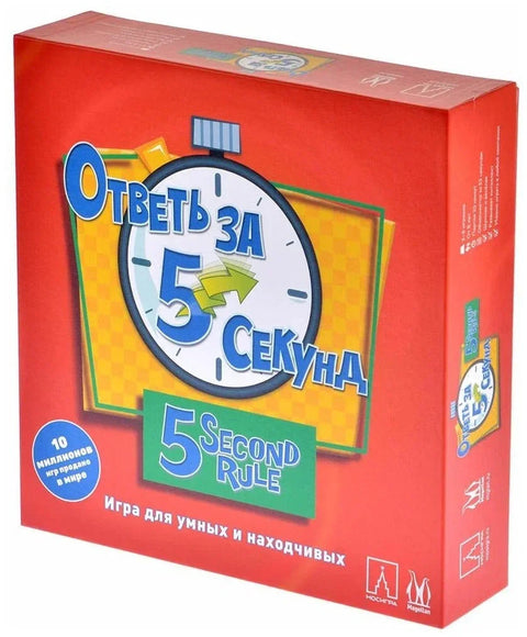 В этой компанейской настольной игре все предложения на каждой карточке начинаются одинаково и с простой фразы «Назовите 3 …»; продолжение же у этого словосочетания может быть абсолютно любым. Назовите три способа поздороваться, три марки автомобиля на «М», трех пресноводных рыб, три признака наступающей весны и т.д. В настольной игре Ответь за 5 секунд вас ждут целых 770 подобных вопросов, на которые, как вы уже догадались по названию игры, нужно будет успеть ответить всего за пять секунд.
