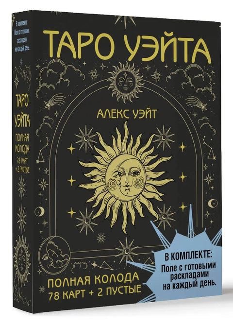 Перед вами полная колода Таро Уэйта: 78 карт + 2 пустые. В подарок к ней — полноцветное руководство с подробным описанием карт и поле для раскладов!Таро — древнейшая предсказательная система. С тех пор как она стала известна человечеству, значения карт обросли домыслами и фантазиями. Колода Уэйта — одна из немногих, донесших до нас суть первоначальной системы Таро. Однако и с этой колодой надо уметь работать, свои тайны она открывает не всем.Трактовка карт по стандартным значениям и онлайн-гадания — скорее развлечение, они не дают точных прогнозов. Чтобы научиться гадать по-настоящему, надо знать символику Таро. Толкования, сделанные истинным Мастером, раскроют глубинную суть каждой карты — то, что известно лишь самым опытным тарологам. С помощью книги, которая прилагается к колоде, даже новичок быстро научится понимать символику Таро, слышать, что говорят карты, и делать точные предсказания.Поле для раскладов поможет вам сразу же, без детального изучения, сделать первый настоящий расклад. Просто выложите карты на поле и получите ответ. Поле создано для двух раскладов — на ситуацию и на будущий месяц. Но после того, как вы научитесь общаться с картами, вы сможете делать расклады самостоятельно.Начните гадать прямо сейчас!